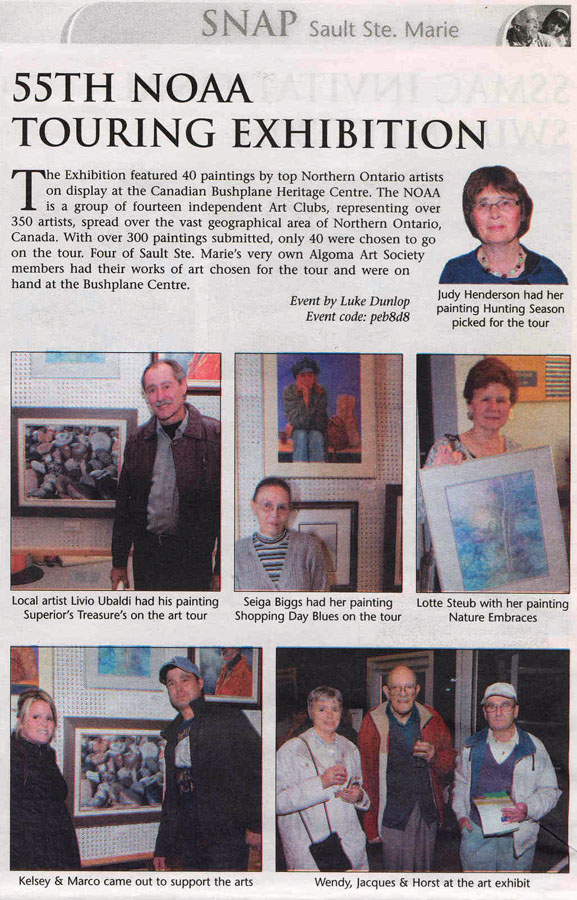 - 53rd NOAA Displayed in Sault in August 2010 in empty store space in Station Mall. Over 700 visitors dropped in to view. AAS Art Show & Sale in the same location for one week following 53rd NOAA. Close to 300 visitors. Excellent exposure to the public.