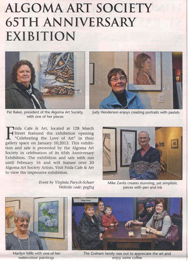 Algoma Art Society’s 65th Anniversary Celebration – titled “ For the Love of Art’ held at Frida Café and Art from Jan. 10th to Feb. 15th. Opening night well attended by local dignitaries, members, and public. Show feature with Pat Baker on Channel 10 Shaw.