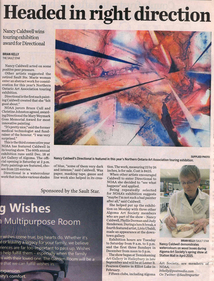 60th Annual NOAA Juried Painting Exhibition – opened Sept. 24, 2016 in Haileybury at Temiskaming Art Gallery. Nancy Caldwell won award for Most Innovative Painting. Phyllis Dorman, Judy Henderson, and Livio Ubaldi also accepted