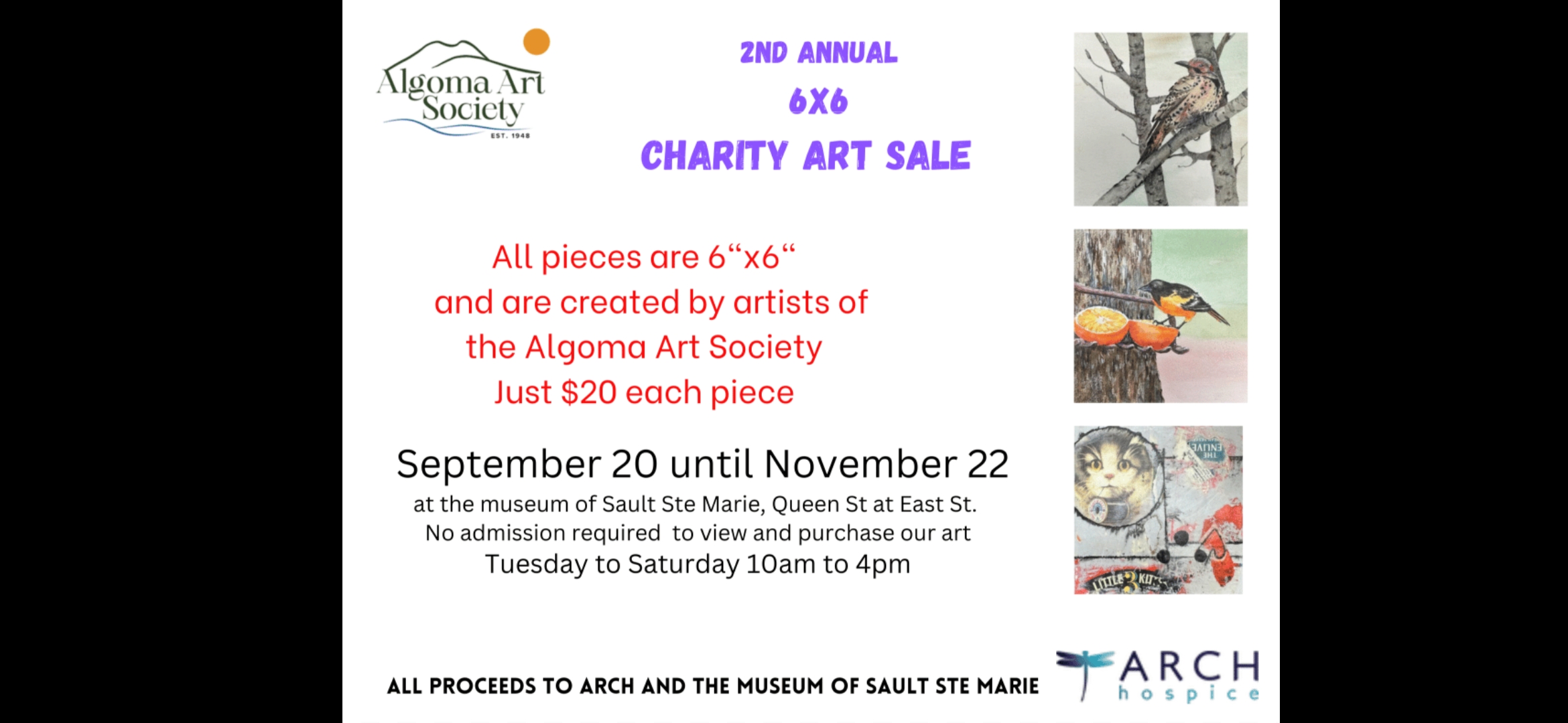 The sale of 6x6 paintings by Algoma Art Society members is currently being shown in the Museum Gift Shop. The price for these paintings is $20.00. Proceeds from the sale of these paintings goes to ARCH. These paintings are being displayed from Monday November 3rd to Monday November 26th, 2025.