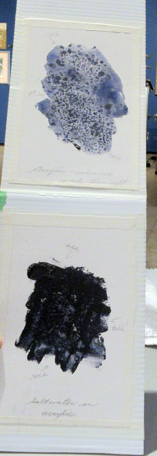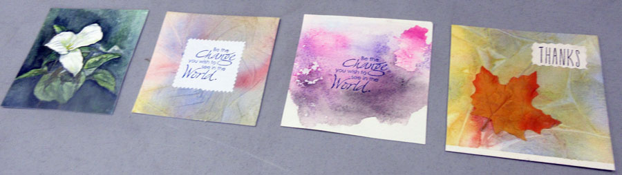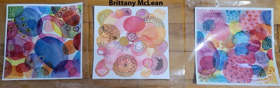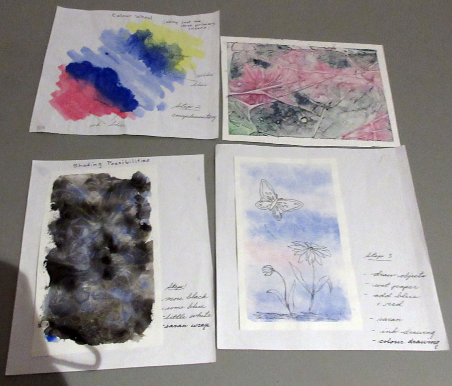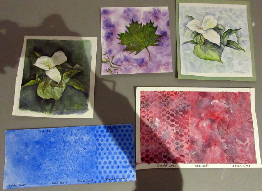 At our meeting Nora Ann Harrison did a very interesting presentation on different types of salt combined with watercolour paint to achieve different effects using plastic wrap and bubble wrap. Nora emphasized playing around with colour and textures. Lots of samples of her work were passed around to view.