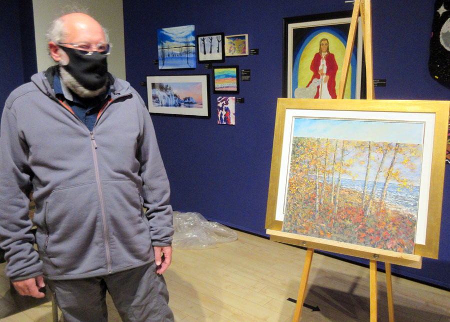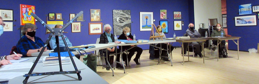 A number of Algoma Art Society members attended the March 13, 2021 Algoma Art Society meeting held in the Main Gallery of the Art Gallery of Algoma. Members got to view the Winter Festival of Art Exhibition with the theme "Finding Joy!"