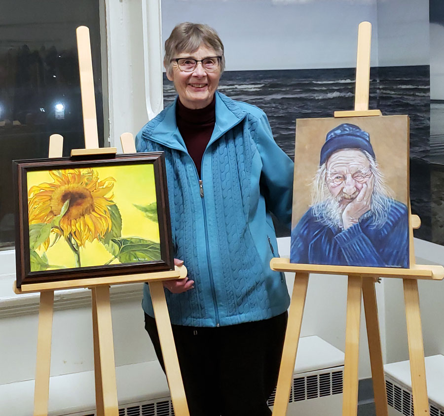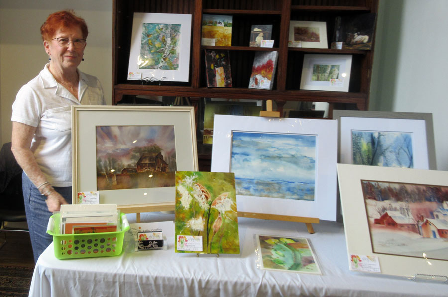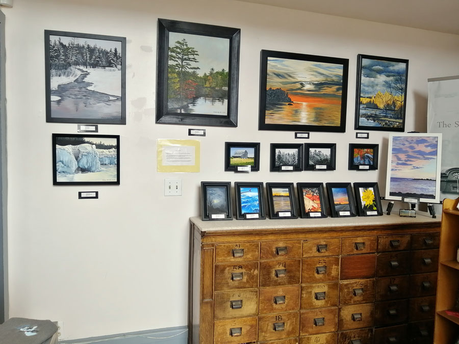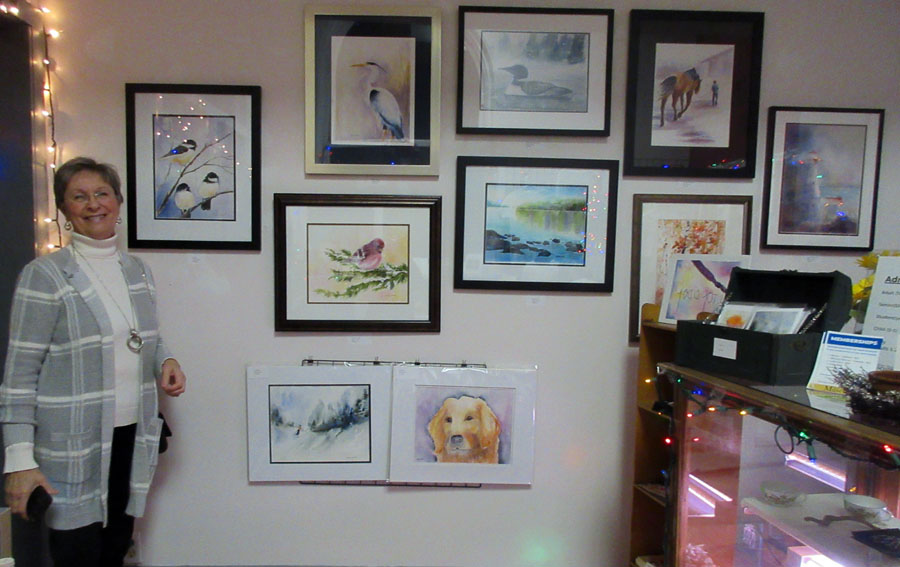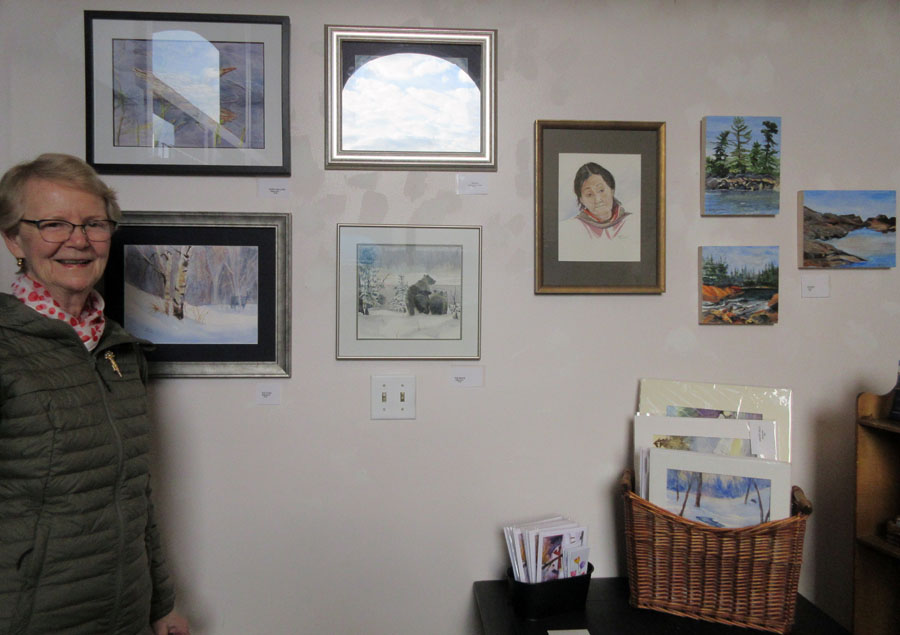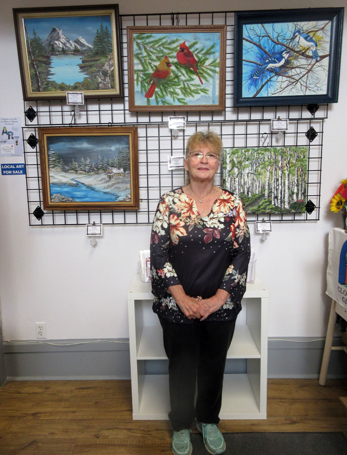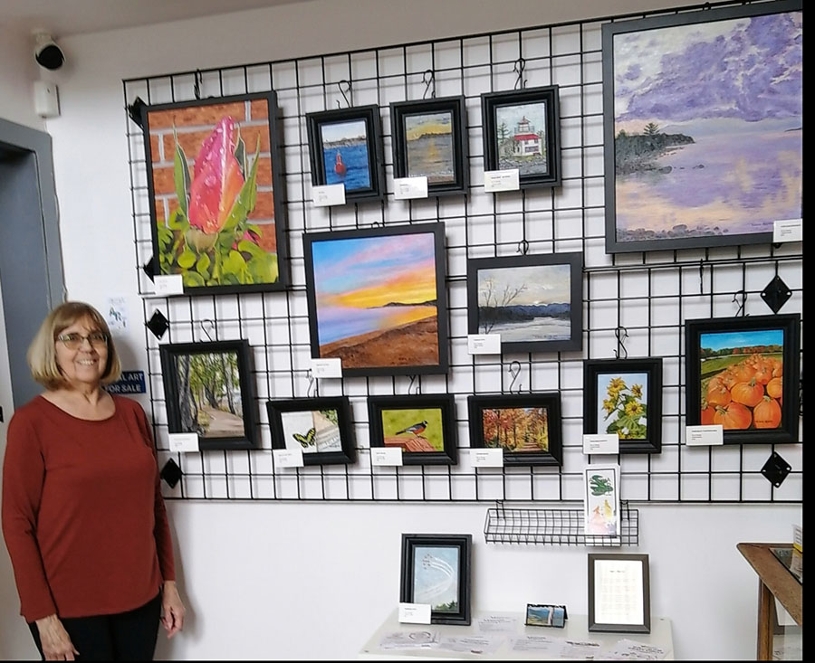 Photo of Sharon Mulligan with her beautiful display of paintings and unframed art pieces for sale in the Gift Shop of the Sault Ste. Marie Museum during the month of April: