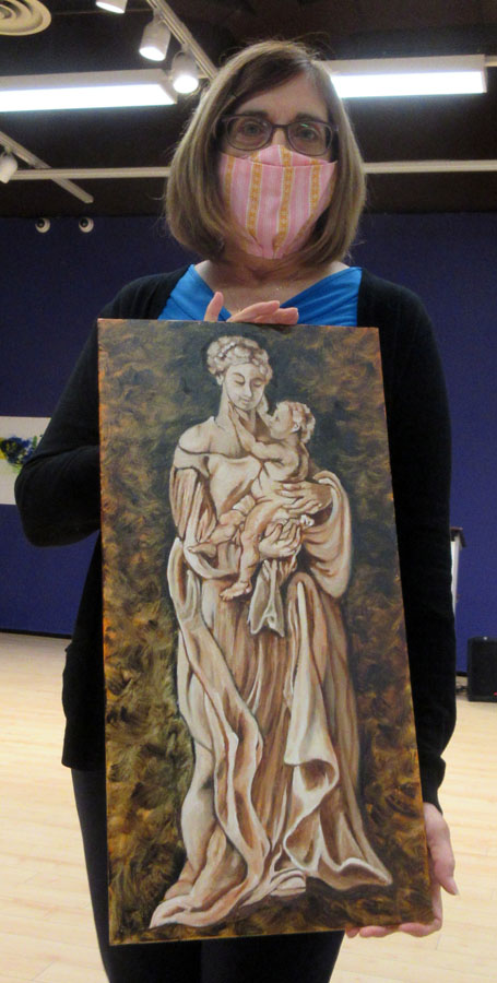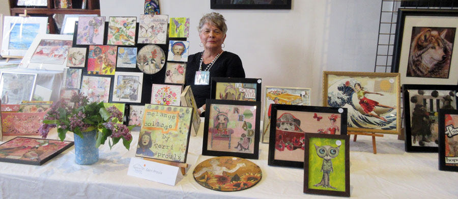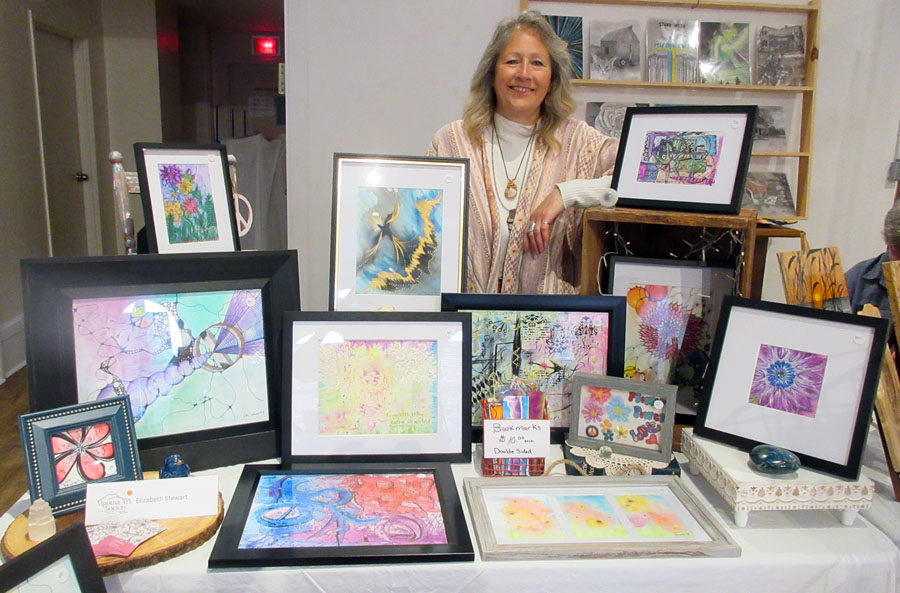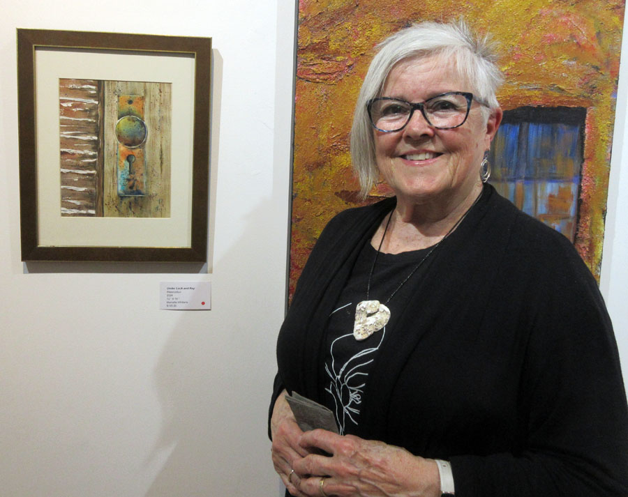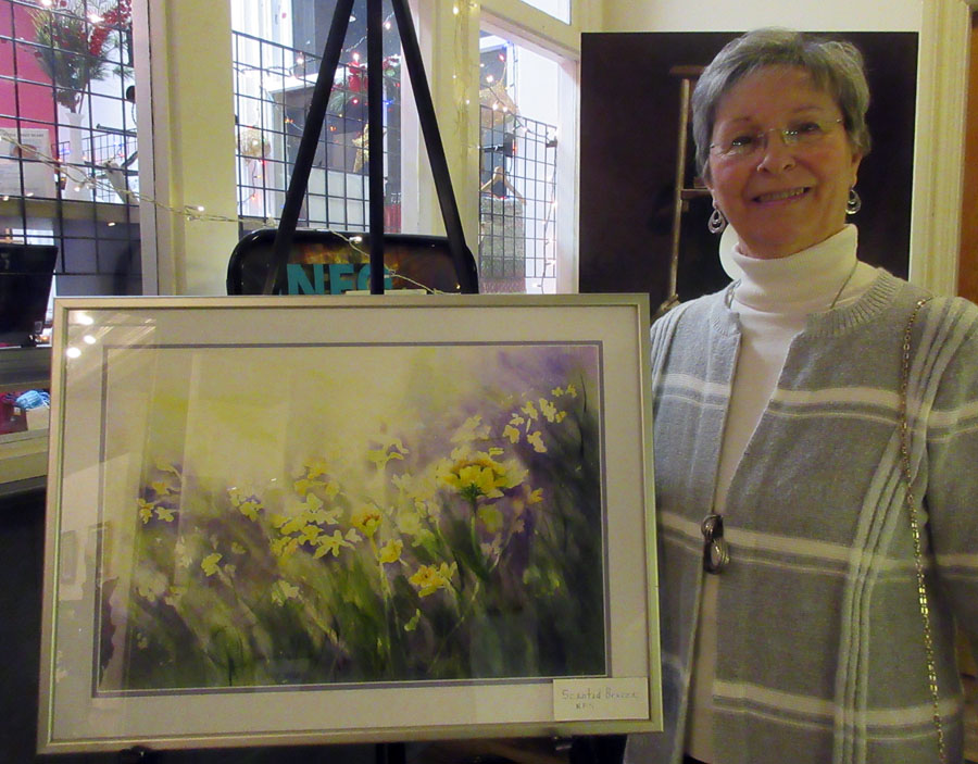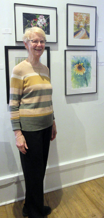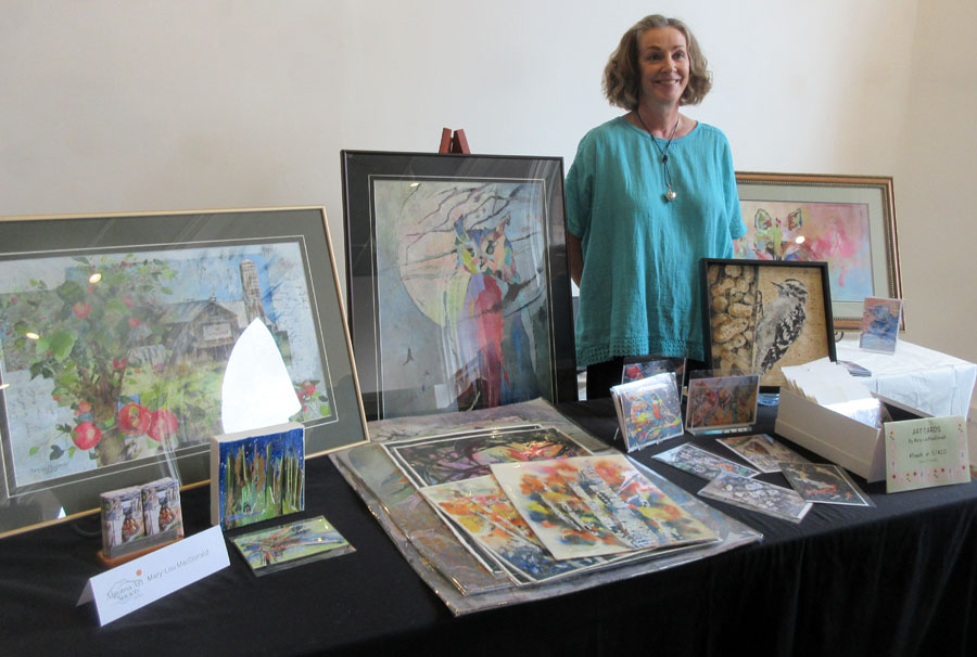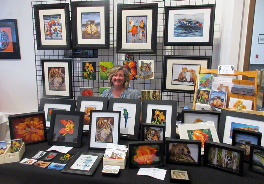Photo of Sharon Mulligan with her beautiful display of paintings and unframed art pieces for sale in the Gift Shop of the Sault Ste. Marie Museum during the month of April: