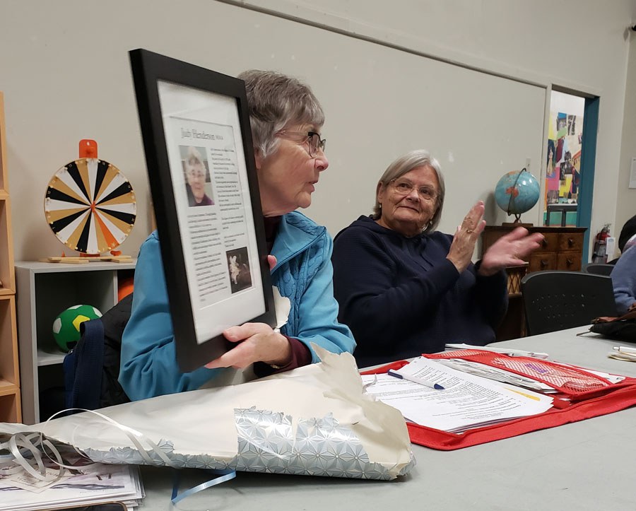 AAS President Cherie Ahvenniemi held a member appreciation night. Judy Henderson felt highly honored to be selected and was presented with a framed montage and a booklet containing a duplicate copy of the montage which all members present signed. Judy was also honored to have her photo of her taken with members.