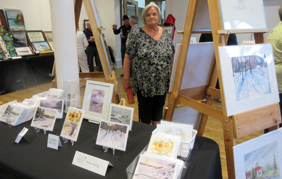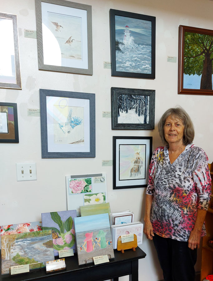 Photo of Lillian Burke with her beautiful display of paintings, unframed art pieces and art cards for sale in the Gift Shop of the Sault Ste. Marie Museum on display from mid-July and the month of August 2024:
