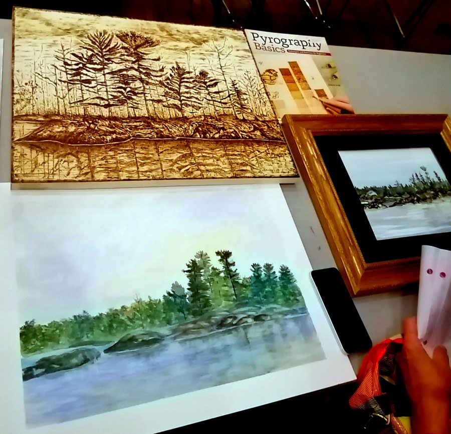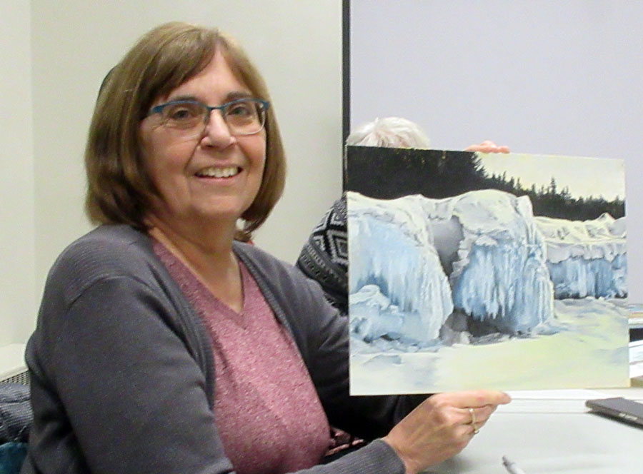 Sophie Nash was the featured artist at the February 12, 2020 Algoma Art Society meeting. Sophie displayed several of her art pieces and passed around a portfolio of her work which members enjoyed viewing. Sophie said that she does a lot of drawing and has been working with watercolour and watercolour with ink lately but that her favourite medium is acrylics. She likes to listen to music while painting. She is currently experimenting with painting landscapes.