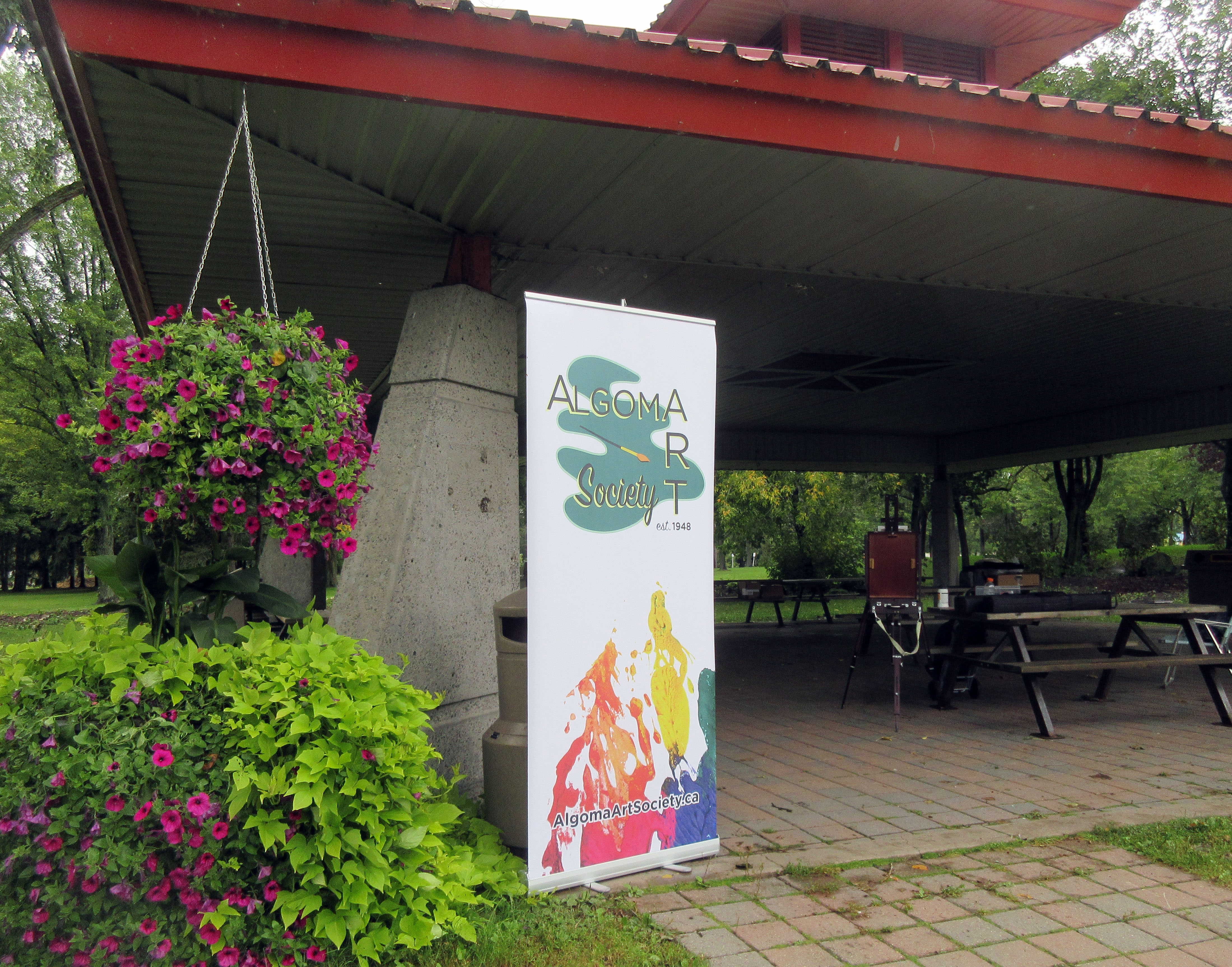 On Sunday, September 13th, 2020 Algoma Art Society members got together at the Gazebo in Bellevue Park where we proudly displayed our new Algoma Art Society Banner. From 11:00 a.m. to 1:00 p.m. Rudy, Sharon, Ken and Valerie worked on Plein Air Paintings exploring various interesting park subjects such as florals and landscapes.