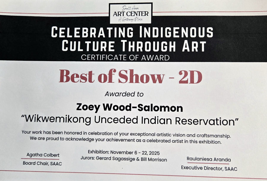 Zoey won Best in Show at an Indigenous art exhibition entitled "Celebrating Indigenous Culture Through Art" held at Alberta House in Sault Ste. Marie, Michigan. The Exhibition is being held from November 8th to 22nd, 2025. Congratulations Zoey!